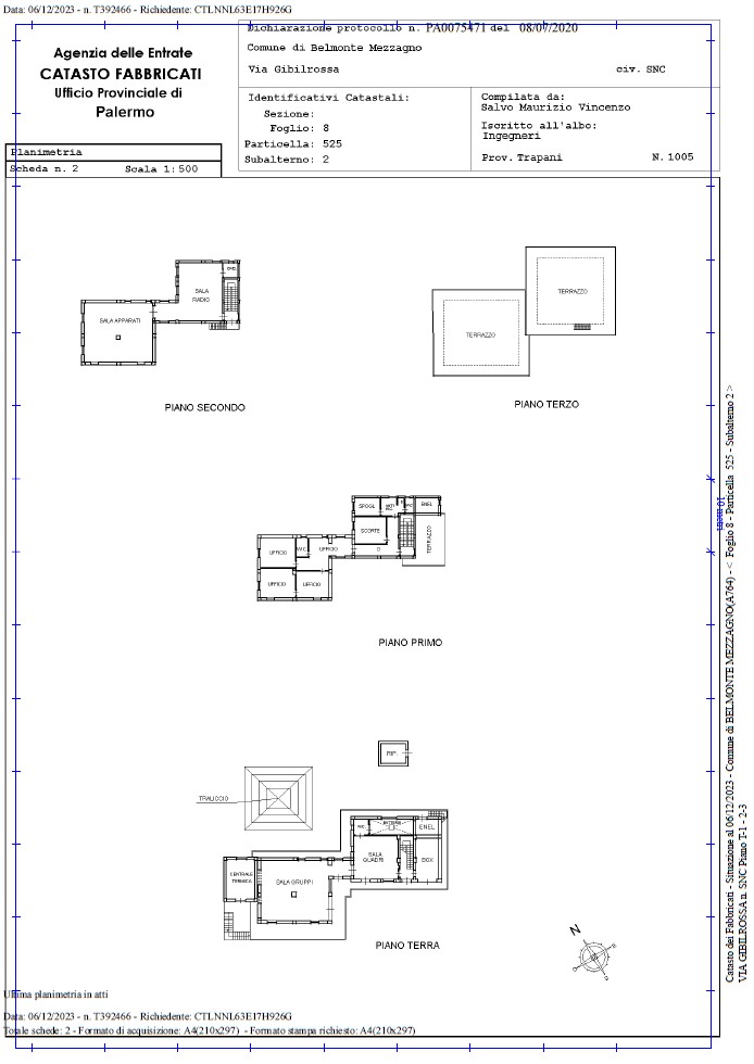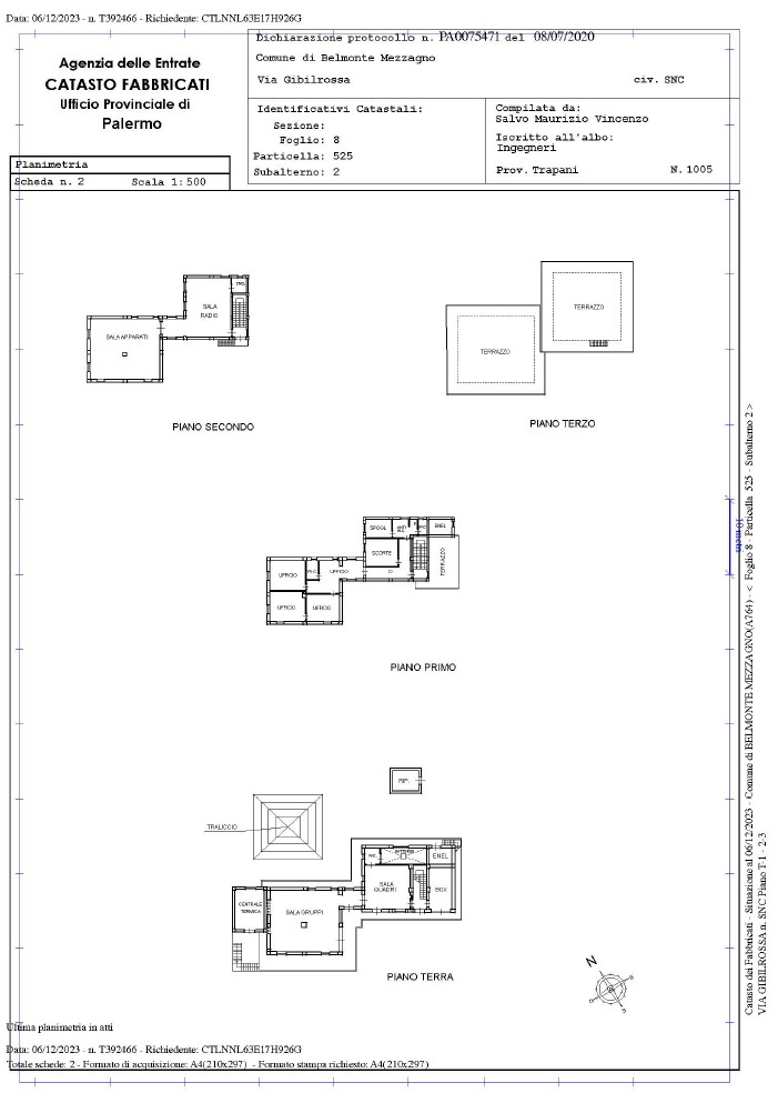 ◦ Fabbricato 1 (Part. 525): Sviluppato su quattro livelli (Piani Terra, 1°, 2° e 3°), censito in categoria catastale D/1.